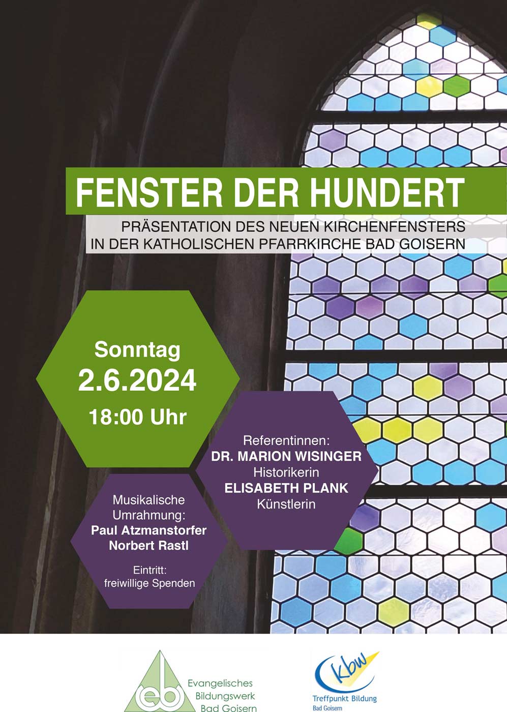 Referentinnen sind die Historikerin Dr. Marion Wisinger und die Gestalterin des Fensters, Elisabeth Plank. Für die musikalische Umrahmung sorgen Paul Atzmanstorfer und Norbert Rastl.